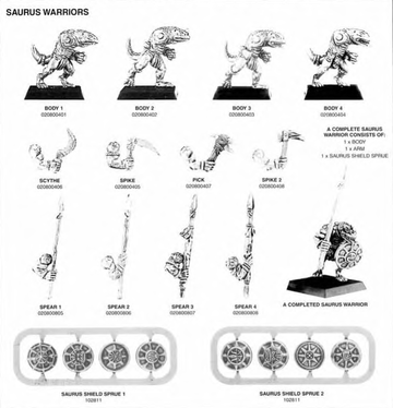 Released in February 1997. 4 different body variations were sculpted (shared with the Saurus Warriors with hand weapons), as well as 4 different arms with spears. Also included a Saurus Shield Sprue.
